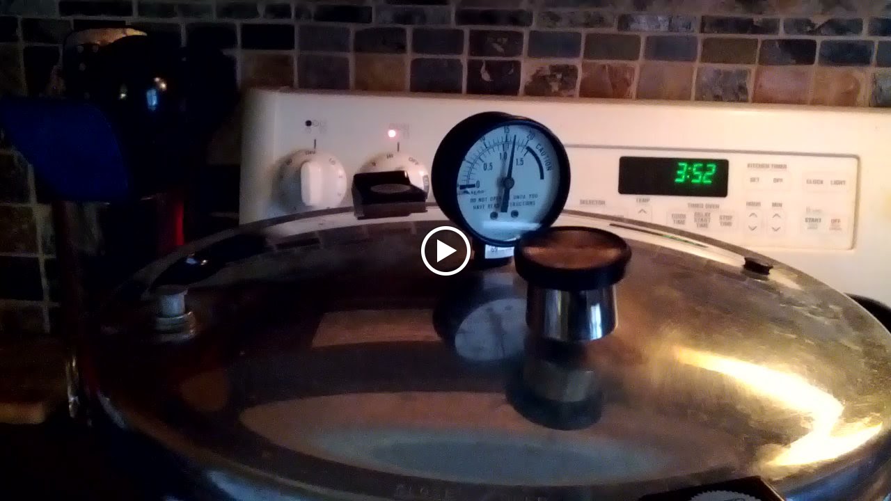 Once I brought the wort to a boil, I used a ladle and funnel to pour the wort into the jars and put them in the pressure cooker that already had boiling water going. Once the 8 jars were filled, I put the pressure cooker lid on, turned the burner on high and brought the pressure up to 15 psi and boiled for 15 minutes (15 @ 15).